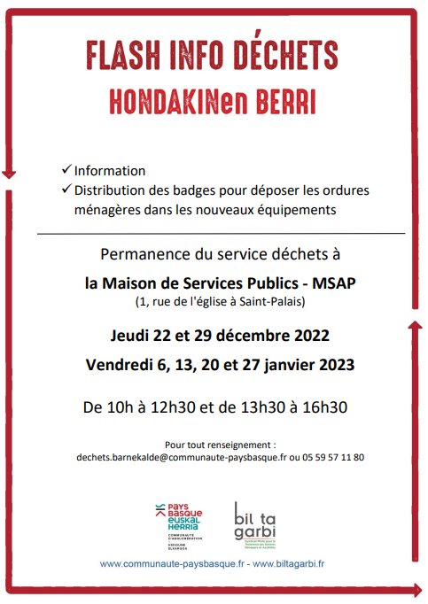 Les personnes n’ayant pas récupérés leurs badges pour déposer les ordures ménagers, sont priées de se rapprocher de la Maison des Services Publics de SAINT PALAIS les jeudis de décembre et les vendredis de janvier (voir affiche ci-dessous).