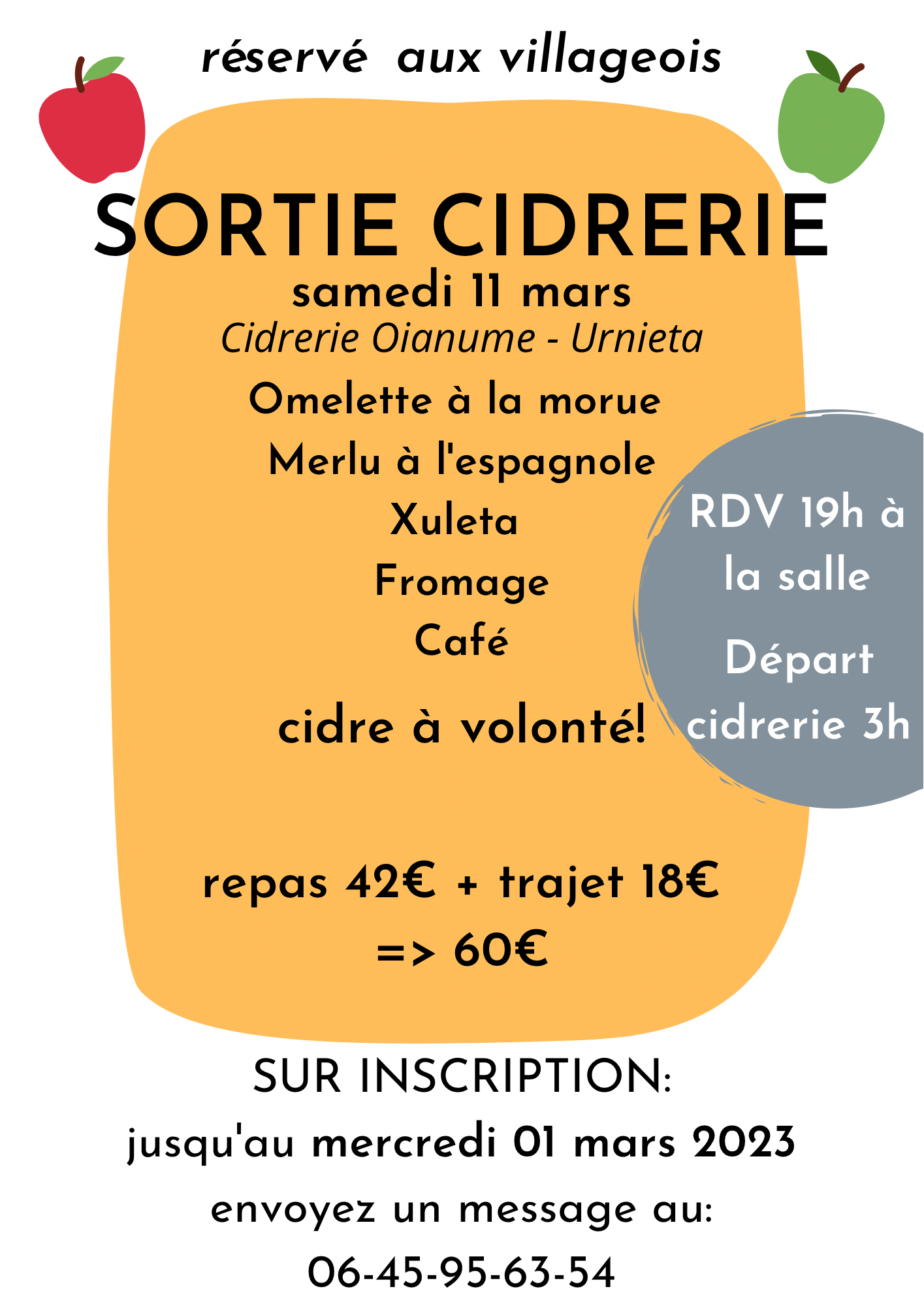 Pensez à vous inscrire pour le repas cidrerie organisé par le comité des fêtes le samedi 11 mars à la cidrerie Oianume – Urnieta.
